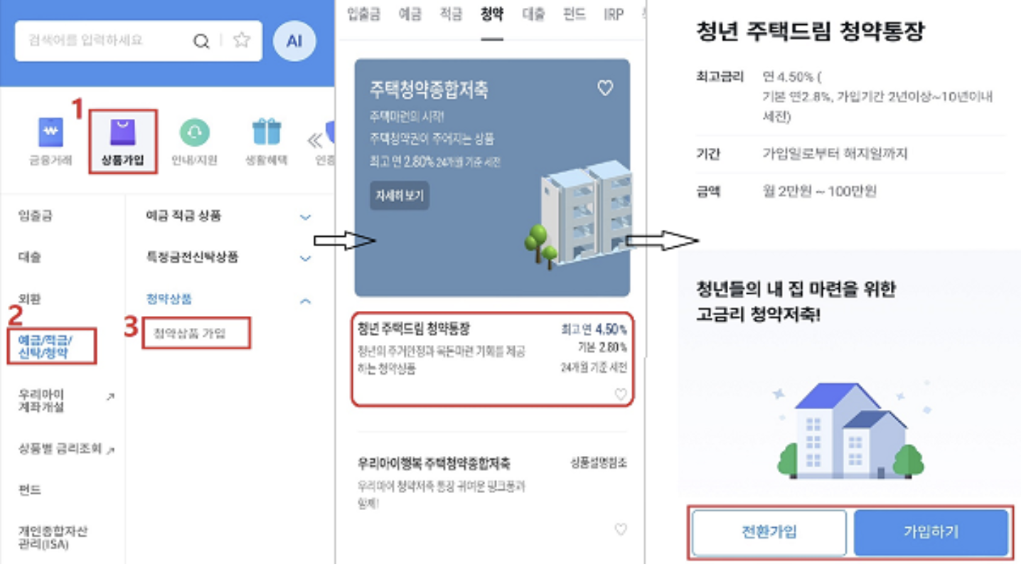 기존 주택청약종합저축을 보유하고 있는 경우, 청년 주택드림 청약통장으로 전환할 수도 있습니다. 전환하는 절차는 다음과 같습니다.